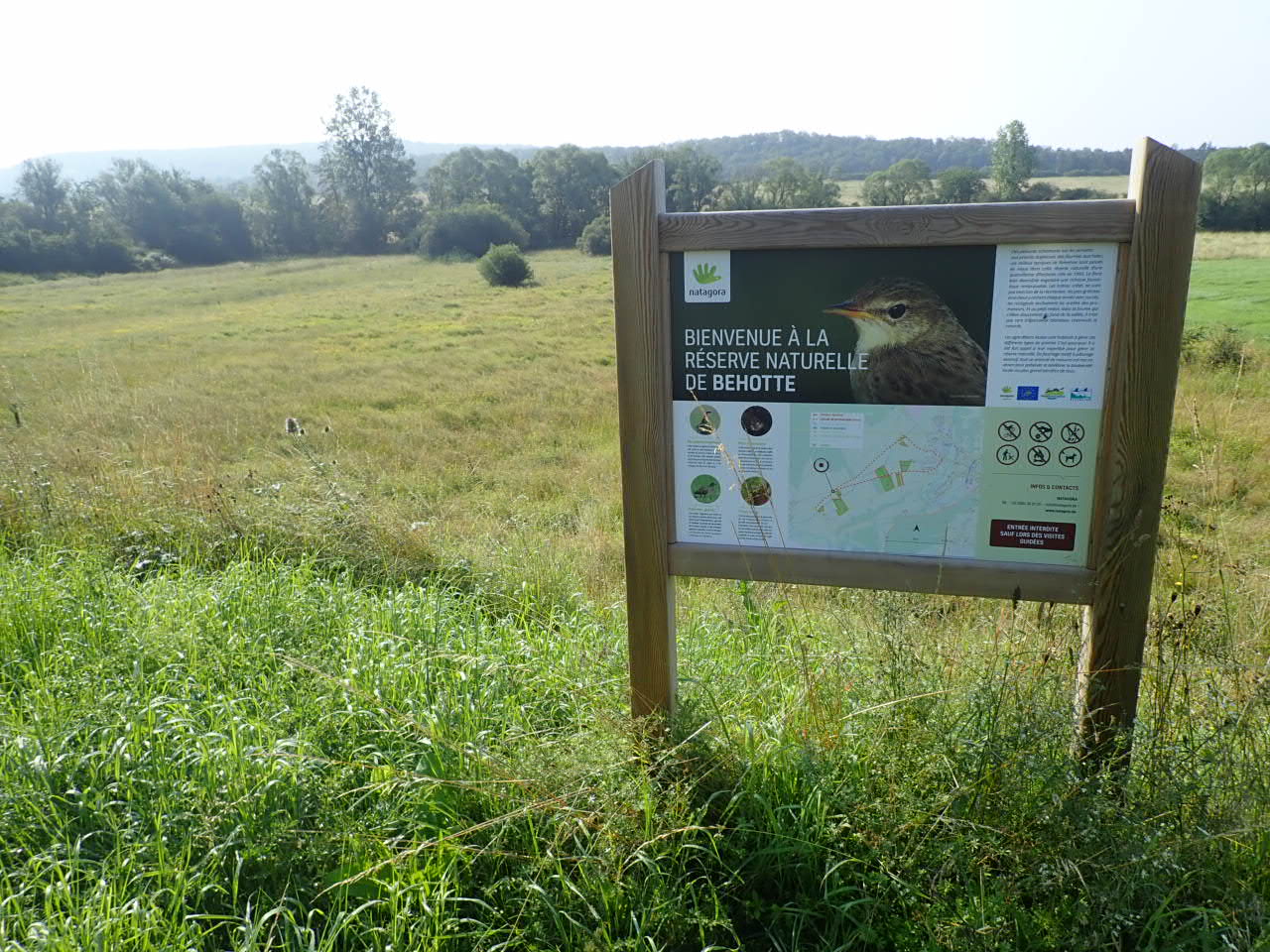 Située à proximité de la ville de Rochefort, la plaine de la Behotte est une vaste étendue herbagère. Logée dans cette plaine, la réserve naturelle d’une quarantaine d’hectares permet la protection des prairies extensives de fauche, de pâture et de mares. Elle est compartimentée par un très riche réseau de haies vives. Nous marcherons sur le RAVeL pour accéder à une aire de vision au cœur de la réserve avec ses aménagements didactiques pour le public. Des pelouses schisteuses au fond de Famenne ou des prairies humides aux larges haies, ce sont tous les milieux famennois typiques qui sont passés en revue dans cette réserve naturelle. La flore bien diversifiée engendre une richesse faunistique remarquable : le triton crêté y a été retrouvé, la pie-grièche écorcheur y niche chaque année et le rossignol philomèle enchante les oreilles des promeneurs. Au petit matin, dans la brume qui s’élève doucement du fond de la vallée, il n’est pas rare d’apercevoir chevreuils ou renards. Fauvettes, bruants, locustelles et tariers, tous ces oiseaux des prés bocagers sont aussi des stars du site. Dans le cadre du projet LIFE Prairies bocagères, les agriculteurs locaux, habitués à gérer ces différents types de prairies, apportent leur expertise pour gérer la réserve naturelle.