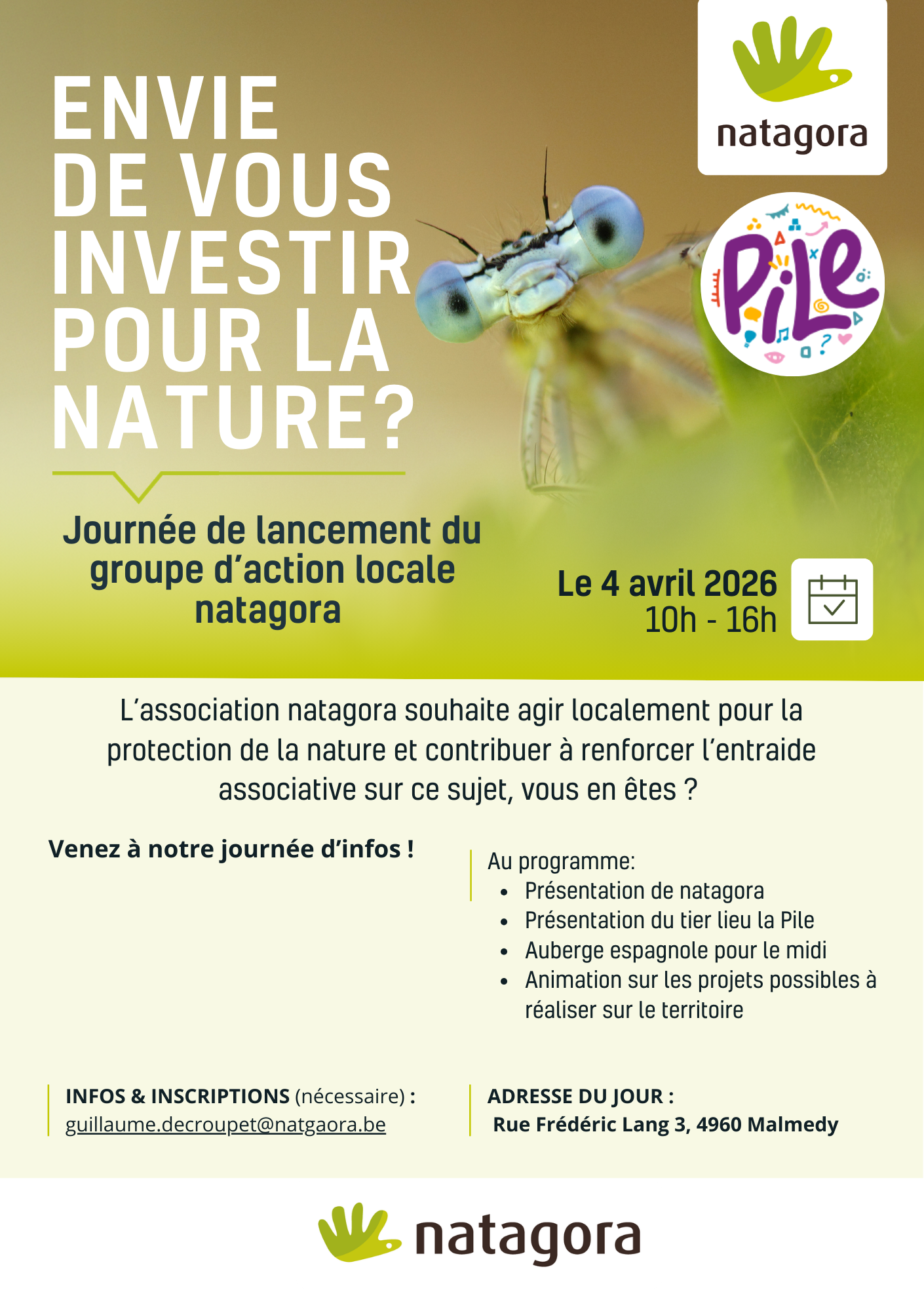 Le 4 avril de 10h à 16h lancement d'un groupe d'action locale Natagora sur le territoire de Trois-Ponts, Stavelot, Malmedy et Waimes. Le lieu de la rencontre est à Malmedy au tier lieu la Pile : Rue Frédéric Lang 3, 4960 Malmedy